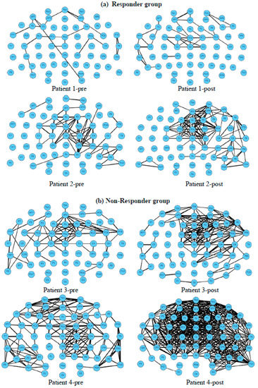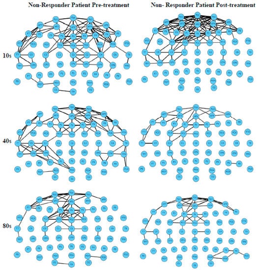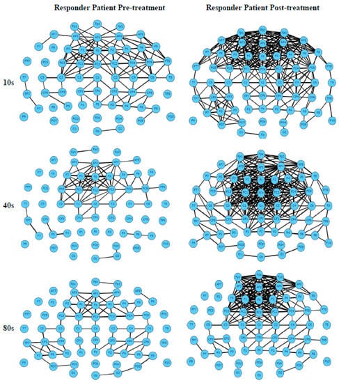 The functional connectivity graphs generated from 80 s of EEG data (averaged across patients) in the non-responder and responder groups, pre- and post-treatment.