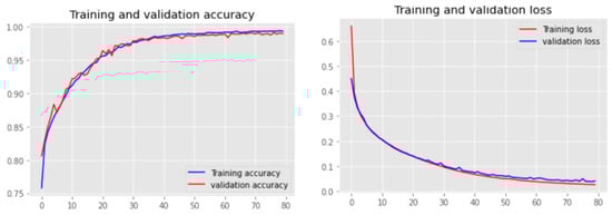 Figure 7 shows the accuracy and the loss curves during CNN training. In the experiments, we used different epoch numbers (from 20–100) and learning rates (0.01, 0.001, 0.0001, and 0.00001) with the aim of finding the optimal parameters that generate the highest accuracy. After 80 epochs of training with learning rate of 0.00001, the overall accuracy of the model was reached to 98.94%.
