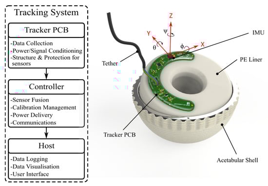 Additionally, this technology provides a preliminary understanding for smart, telemeterized implants that could provide patient feedback about the performance and success of their total hip replacement; although, in its current form, the system has two notable limitations that would need to be addressed before it could be considered for use in vivo. The first is the use of a tether for power and communications, as passing wires out of a patient is an invasive and unrealistic solution. Second, the measurements were relative to a static reference frame, meaning that if the acetabular shell moves from its initial orientation, for example due to a hip rotation when waking, the true rotations of the liner are not known. The introduction of an acetabular tracker could be used to mitigate these effects.