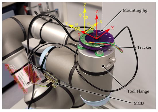 MEMS IMUs offer significant size and power savings over mechanical and optical variants at the expense of measurement accuracy [20]; however, this can be improved by calibrating the sensor packages within the IMU on a chip-by-chip basis. This was achieved by subjecting the trackers to a series of controlled static and dynamic tests while measuring the raw sensor outputs to calculate the calibration factors. These were applied to the data prior to the sensor fusion. A desktop-mounted robot arm (UR3, Universal Robots GmbH) was used to manipulate the trackers while gathering the calibration data. For the alignment of the reference frames, the trackers were affixed to a jig (Figure 3) that could be rotated about the tool flange’s Z-Axis and locked in place.