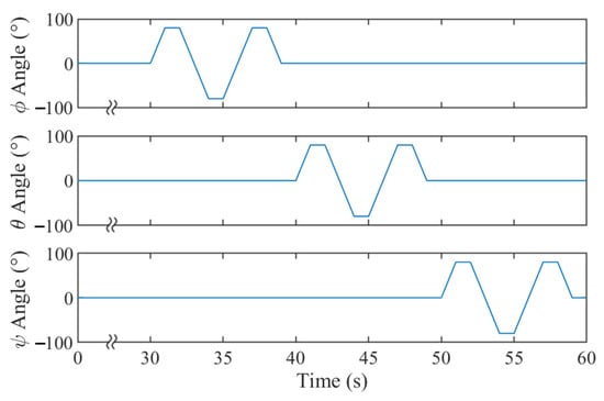 For evaluating a fixed , 41.5 °·s−1 was chosen and the same values from the constant ROM testing were used as they were known to run within the performance limits of both the robot arm and the hip simulator. The known robot poses were defined in the Tait–Bryan angles from the ROM and the sequence shown in Figure 6 and were then converted to quaternions using the eul2quat function of the MATLAB Robotics Systems toolbox [26]. The final test parameters are detailed in Table 2.