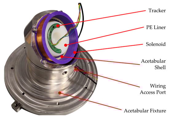 Photograph of the tracker and solenoid mounted to a DM implant cemented into the acetabular fixture used for in vitro testing with the key features labelled. The tether from the tracker passes between the solenoid and the wall of the fixture and out through the access port along with the power for the solenoid.