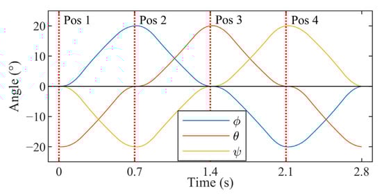 The testing was performed on the robot arm setup detailed in Section 2.2, and a real-time data exchange (RTDE) was used to timestamped tool flange orientations at 125 Hz. A modified python script from the manufacturer [25] was used to trigger the RTDE and log the results to a file on the trackers’ host PC. Each test consisted of 60 cycles whereby the robot sequenced through four different poses. These were selected such that each axis oscillated about the origin by a specified range of motion (ROM). The speed of the axes was dictated by setting the period for the cycle, and the motion planning between each pose was automatically managed by the robot’s inverse kinematics. An example of how test motions were timed is shown in Figure 6.