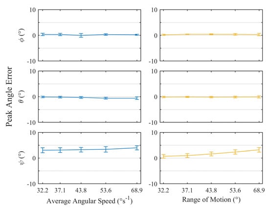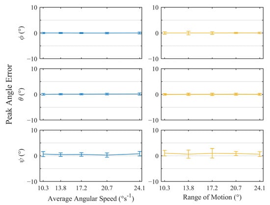 Using the solenoid (Figure 10) lead to noticeable improvements in the precision across all axes, bringing the maximum standard deviation for the φ, θ, and ψ rotations down to 0.7°, 0.5°, and 1.0°, respectively. These results were in line with the findings of the ideal conditions study. Once again, the average error for φ and θ were similar, with a maximum of 0.4°, with little variation due to the angular speed or range of motion.