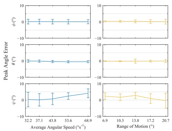 Plots of the mean angular error ± standard deviation for all peaks across n = 5 trackers, while undergoing test motions under ideal conditions. The left- and right-hand plots illustrate variation of error with respect to average angular speed and range of motion, respectively.