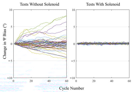 Noticeably, more erratic behavior was observed when the solenoid was not used with a maximum change in the ψ bias of 8.3° over 60 cycles, indicating a significant drift in the zero value from the start of the test. Additionally, the magnitude and direction of the drift was inconsistent and therefore would be difficult to account for with generalized mathematical models. Conversely, introducing the solenoid reduced the average change in the ψ bias to near zero for all tests, with any measurable variation being attributable to the noise in the magnetometer readings. All data produced during this test and the associated MATLAB scripts can be found in the University of Leeds Data Repository (https://doi.org/10.5518/1232).