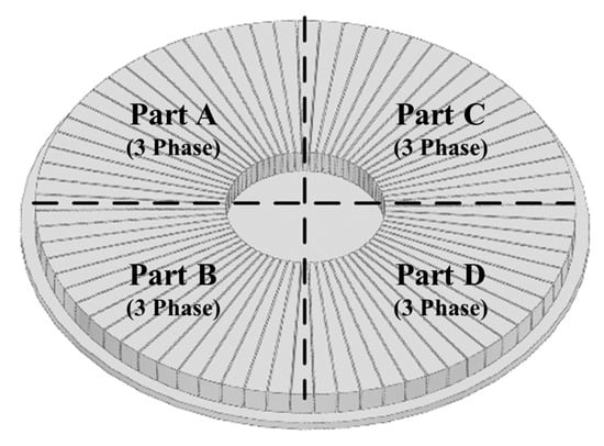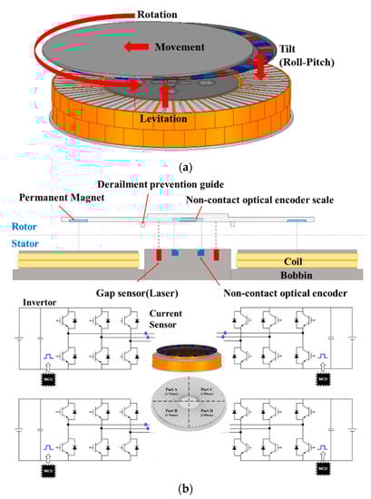 The motor of the 6-DOF magnetic levitation system proposed in this paper has the same structure as the axial flux permanent magnet motor as shown in Figure 1a, but it is a system in which the shaft and bearing are removed by using magnetic levitation to replace the existing spin coater. In general, current vector control used to control a permanent magnet motor converts the current applied to the stator into a d–q-axis current, and each current can be controlled independently. Therefore, the q-axis current can be used for rotational motion of the 6-DOF magnetic levitation system, and the d-axis current can be used for magnetic levitation through the repulsive force between the permanent magnets of the rotor [2,3,4,5,6,7]. That is, the rotation and levitation control of the system is possible through the vector control of the current applied to the stator [8,9]; and the stator is divided into 4 parts for additional axial movement, such as tilt (roll–pitch) and movement in the x–y axis. It is designed as a 4C1M (4 Controller 1 Motor) system consisting of 4 controllers in one motor to enable different vector control for the 3-phase current for each part of the stator [10,11]. Additionally, the sensor base, composed of gap sensors for measuring the levitation position of each part of the stator and non-contact optical encoders for measuring the rotational position of the rotor was designed in the center of the system for control of each axis movement. Figure 1b shows a cross-section of the 6-DOF magnetic levitation system and the structure of 4C1M.