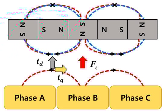 For the levitation of the rotor, a Halbach-array permanent magnet was applied to the rotor. As shown in Figure 3, the Halbach-array permanent magnet increases the magnetic flux in the air gap through the synthesis and cancellation of the magnetic flux generated from nearby permanent magnets and can decrease the magnetic flux in the opposite direction of the air gap. The rotor is lifted by using the repulsive force generated by the interaction between the magnetic flux generated by the permanent magnet and the magnetic flux caused by the current flowing in the stator coil. The current applied to the coil can be explained by decomposing it into two directional force components (, ) as shown in Figure 3. The D-axis current component corresponds to the magnetic force, and it can realize the force that creates the levitation force through interaction with the permanent magnet attached to the rotor. Additionally, the q-axis current component creates the rotational force of a typical motor. in Figure 3 means repulsive force. Since the position of the rotor can be measured in real time through the encoder, the current can be controlled to match the polarity of the magnetic flux generated from the permanent magnet for all positions of the rotor, so even if the position of the rotor changes due to rotation, stable levitation is possible by generating a certain repulsive force. The total repulsive force for rotor levitation is the sum of the repulsive forces generated in each part as shown in Equation (1). (Each part means parts of the stator divided into 4 parts.)
