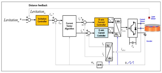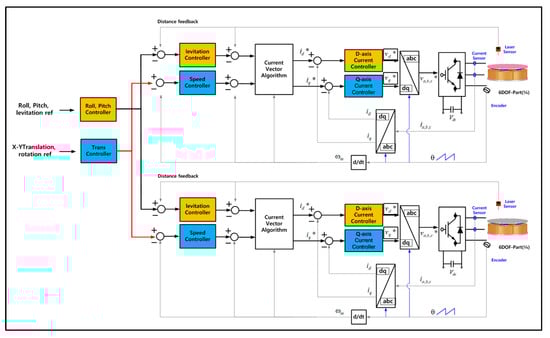 Above, the method of controlling the levitation and tilt control, rotation and X–Y movement within the sensing range of each sensor has been described. For the integrated driving control of the 6-DOF magnetic levitation system based on this, a system integrated control algorithm considering the limit of the sensing range is required. Levitation and Roll–Pitch control the force generated on each axis through the d-axis current control. To this end, the d-axis current should be generated by calculating the final command of each part of the stator divided into four parts as the sum of the tilt and magnetic levitation control commands. Rotation and X–Y axis movement control the force generated on each axis through q-axis current control. As in the previous method, the q-axis current is generated by calculating the final command of each part of the stator as the sum of the rotation and X–Y axis movement control commands. Figure 13 shows d–q axis control block diagram of each part of the stator divided into 4 parts for the integrated drive control of the 6-DOF magnetic levitation system.