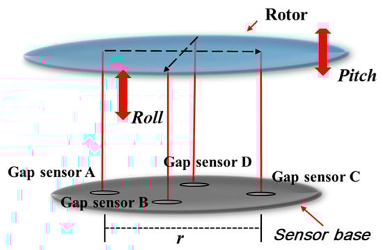 The control of the tilt (Roll–Pitch) is possible by controlling the levitation position by generating different forces on each part of the stator divided into four parts. To control the tilt (roll–pitch), measure the distance(r) of the non-contact position sensors in the sensor base and the levitation position as shown in Figure 5, and calculate the tilt of the rotor using Equation (4).