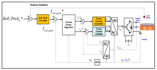 In order to control the roll–pitch by giving the difference in the levitation position of each part, the measurement values of two non-contact position sensors are needed to calculate the tilt command. The control block diagram for tilt control is shown in Figure 6. As in the previous levitation control method, when the tilt command (* is input, the current command (*) for each part is output through the roll and pitch controller. Then, the current command is converted into a d-axis current command ( through the current vector control algorithm, and the required voltage is applied to the inverter through the current controller.