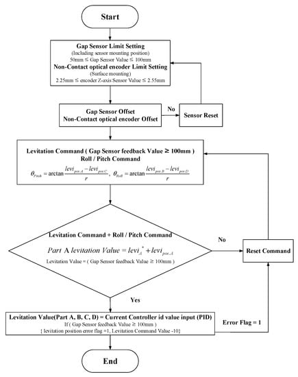 The system control algorithm was configured by applying an algorithm including derailment prevention and reset functions to the levitation, movement, roll and pitch controllers in the manner shown in Figure 15.