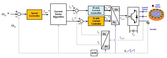The control block diagram for 6 degree of freedom rotation control is shown in Figure 9. Similar to the rotation speed control of a general motor, after measuring the position information of the rotor through the encoder, the current command is generated through the speed controller. Then, based on the q-axis current command generated through the current vector control, the voltage is applied to the inverter.
