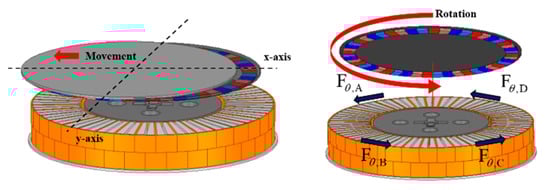 In order to simplify the system for moving the nozzle used in the EBR process after the photoresist coating process on the semiconductor wafer, it is necessary to move and control the X–Y axis (position) of the magnetic levitation system. When the rotational speed is differently controlled for each part, a difference in centrifugal force occurs in each part of the rotor, and as a result, the rotor moves in one direction due to the imbalance of the centrifugal force [12]. That is, the X–Y axis movement control of the rotor of the magnetic levitation system proposed in this paper generates a difference in rotational force for each part of the rotor as shown in Figure 6 and Figure 10, artificially generating eccentricity in the X or Y axis so that it is to generate the force that can move the rotor. represents the rotational force generated from the stator of each part, and , which generates the force of movement, is generated by using the difference between the two forces corresponding to the X–Y axes.