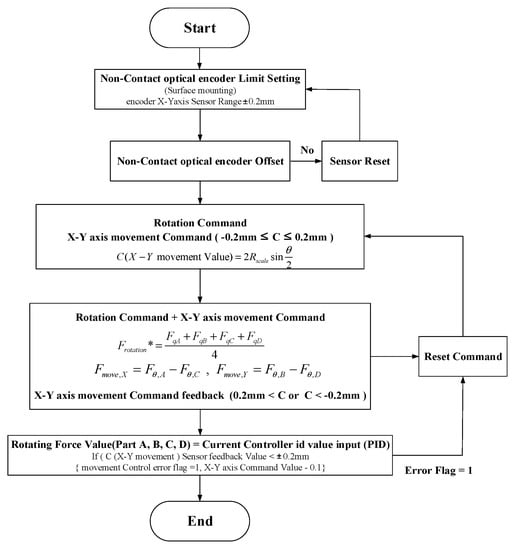 Non-contact encoders that use the method of sensing the encoder scale attached to the rotor have a limited sensing range for the X–Y axis. However, even if changes (errors) occur in the position of the encoder scale and sensor according to the movement of the X–Y axes of the rotor, position control is possible within the sensing range as shown in Figure 11. Therefore, as shown in Figure 12, an X–Y axis movement control process was designed that can control the X–Y axis movement within the sensing range of the non-contact encoder and which restores the rotor back to the sensing range when it is out of the sensing range.
