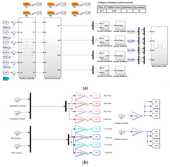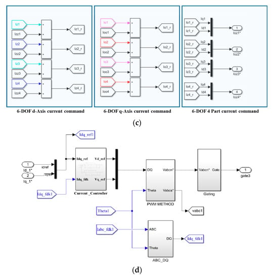 For control simulation of the 6-DOF levitation system, simulation modeling consisting of a 6-DOF controller, current vector controller and 6-DOF levitation system was designed as shown in Figure 14a. The parameters of the designed magnetic levitation system are shown in Table 1. The 6-degrees-of-freedom levitation system is designed in the form of 4 motors to realize a real system consisting of a 4-segmented stator and a single rotor. The six force commands output through each controller were converted into respective current components by distributing the force commands to enable simultaneous control as shown in Figure 14b. Additionally, as shown in Figure 14c, the d–q axis current command is distributed according to each part of the system. A total of four pairs of d–q axis current commands are generated for six-degree-of-freedom motion control (levitation, rotation, tilt, translation). That is, an algorithm was implemented to generate 4 d–q axis current commands by combining 16 current commands to generate 8 current commands for generating a total of 8 forces of the 6-DOF magnetic levitation system [13]. Figure 14d shows the internal variables of the current controller composed of the vector controller in Figure 14a. The current command of is converted into a 2–phase voltage command, and the d–q axis voltage command is converted into a 3–phase voltage command through coordinate conversion and input to the inverter through the gate to generate the output of the grid. Using the current value applied to the motor through each inverter configured as shown in Figure 14a and motor modeling, the current controller re-outputs the voltage command as much as the difference between the current command and the feedback current.