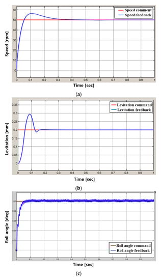 Figure 16 shows the feedback result value for 6-DOF control command. Figure 15 shows the control simulation results for rotation speed command 50 rpm, levitation command 0.2 mm, tilting command (Roll–Pitch) 0.1 deg and X–Y axis movement command 0.05 mm using control simulation modeling.
