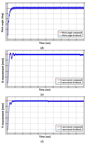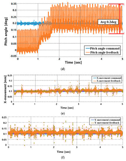 Additionally, the result values of (a–f) in Figure 18 appear as if many ripple components occur as a whole (average 0.2 mm, 0.2 degree). However, in the case of precise control, even a small ripple component can greatly affect the result value, and it can be confirmed that the average value converges to the command relatively well.