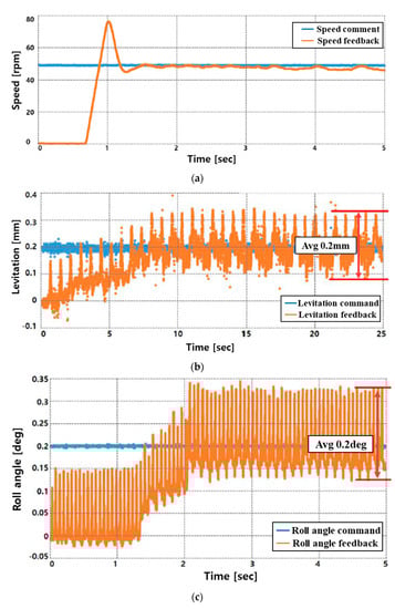 Figure 18a,b are the performance test results for levitation and rotation by inputting a speed command of 50 rpm and a levitation command of 0.2 mm in the system’s stopped state. At this time, the tilt and movement control commands were set to 0. The performance test for tilt and movement was performed within the permissible range of the sensor, and when the rotor was lifted by 0.1 mm and rotated at 50 rpm, the roll–pitch and X–Y axis movement commands were applied to perform the tilt and movement performance. The test results are shown in Figure 18c–f.