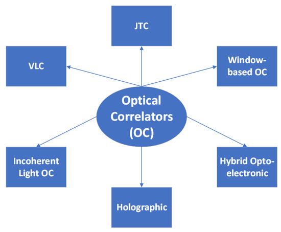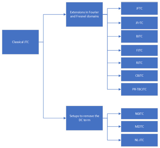 Overview of various alternatives to the classical JTC, where: JFTC—joint Fresnel transform correlator, JFrTC—joint fractional Fourier transform correlator, BJTC—binary JTC, FJTC— fringe-adjusted JTC, RJTC—reference phase-encoded JTC, CBJTC—compression-based JTC, PR-TBCJTC—photorefractive two-beam coupling JTC, N0JTC—nonzero-order JTC, MZJTC—Mach–Zehnder JTC, NL-JTC—non-linear JTC.