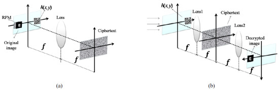 The scheme of a cryptosystem based on JTC. Figures (a,b) present the encryption and decryption processes, respectively [33].