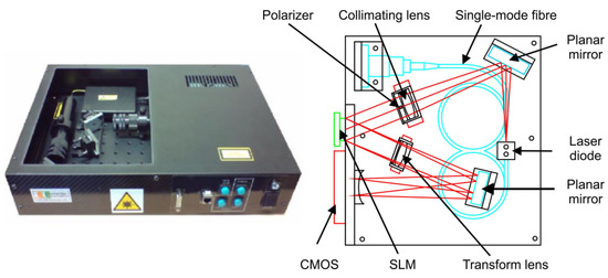 Practical versions of the JTC correlator have also been developed, such as the Cambridge correlator, associated with the FOE (Fourier Optics Experimenter) software, used for pre-processing the images captured by a video camera, that are afterwards compared by using the correlator. This type of correlator, developed at Cambridge University (thus its name), is presented in Figure 4. It includes a laser diode, SMF (single-mode fiber), collimating lenses, planar mirrors, a polarizer, a spatial light modulator (SLM), an analyzer and a CMOS sensor. The arrangement of the components in a shape like the letter W reduces the distance of electric signal transmission and the processing time. The main disadvantage of this correlator is its size, although in current applications its size is reduced at approximately half of its initial size [42,43,44].