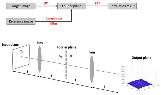 There are several types of optical correlators, among which the most used are the joint transform correlator (JTC) and the VanderLugt correlator (VLC), also named the matched filter correlator (MFC) [3]. The VLC correlator was, historically, the first successful optical correlator, developed by VanderLugt in 1963. In this correlator type, the detection of a target in a scene can be performed automatically by using a filter where the complex conjugated Fourier transform of the object is performed. The images of the scene and a reference are compared, by means of the intensity of the correlation at the output. This device was also named the 4f-correlator, where f is the focal length of the two lenses of the setup, and 4f is the distance between the input and output planes [21]. The VLC correlator is still efficient in applications today; however, it has two important drawbacks: a very high sensitivity to the alignment of the components of the setup and the requirement of specialized hardware [3].
