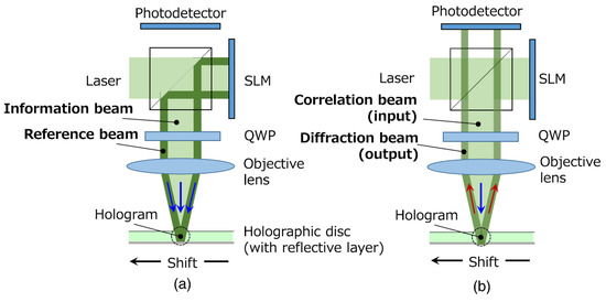 The technique of holographic optical correlation involves a holographic disc, where information about the reference image is recorded as a hologram, and the irradiation on it of the target image data. In the holographic correlator, two beams of light (information and reference) are combined in one, on the same axis. The property of the hologram of shift selectivity is used for performing a multiplexed recording of the combined beam. Figure 6 presents both the recording method (using the information and reference beams) and the correlation method (using the correlation and diffraction beams).