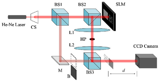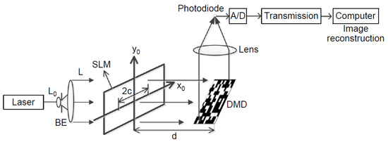 The PST interferometric method was also used in another proposal of encryption of optical images, that employs the JTC and, additionally, compressive sensing techniques [66]. First, a method of binary scrambling is used for a permutation of the object image. Secondly, PST is employed to encrypt and register, as holograms, the field of the permutated object on the JTC. Thirdly, a compression step takes place for both the key and the encrypted images. Finally, the proposed algorithm is used to reconstruct and decrypt the original image. The setup is presented in Figure 7. The efficacy and suitability of the method for secure image transmission were demonstrated by means of numerical simulations [66].