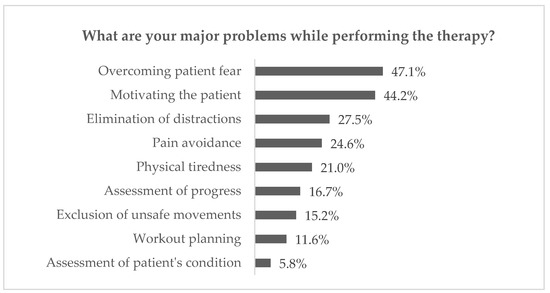 For the purpose of defining needs in contemporary rehabilitation, the questions related to home rehabilitation were analysed. As 38.4% of physiotherapists declared they perform treatment at the patient’s place of residence, the results were considered relevant. Remote treatment can reduce costs for healthcare providers while lowering costs for patients [30,31], especially those with chronic conditions, as it significantly facilitates the process of monitoring their health. It also provides an opportunity for medical consultations for patients in remote locations who cannot quickly and safely reach a doctor [4]. Within the presented research, the investigation was focused on the answers to the following: