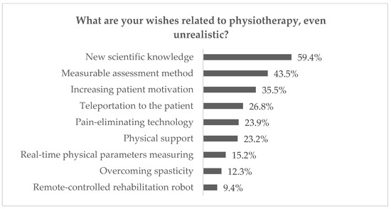 The results of the mentioned questions are illustrated in Figure 1 and Figure 2. As may be observed, the significant difficulties in kinesiotherapy are connected either with a reduction of physiotherapists’ efforts (physical loads and time consumption), encouraging patients (keeping their attention on the constant level, risks reduction or overcoming anxiety) or therapy planning (adjustment of the proper treatment and measurable assessment of progress). Moreover, most of the respondents pointed at yet unknown State of the Art as the most beneficial for the physiotherapy of the future. At the same time, 26.8% of them have chosen instant transportation to the patient’s house as the answer to the second question.