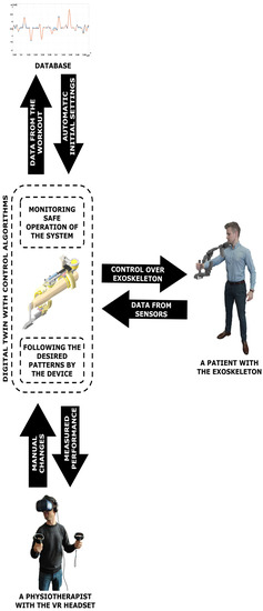 The concept of the presented solution includes the industrial-like application of the digital twin to robot-aided motor therapy. The rehabilitation robots currently used for kinesiotherapy support or resist the motion of a patient. They may be either attached to the body segments in series (by end-effectors) or parallel (as exoskeletons) [56,57]. They are mainly operated by regulators of the motors controlling them so as to follow the pre-programmed trajectories within the time and under unknown loads. This brings higher accuracy and repeatability than the manual treatment with a physiotherapist, but does not give flexibility within the workouts. On the contrary, manual therapy may bring superior outcomes during specific cases which require real-time modification of exercises or experimental search of the optimal motion pattern [57]. Hence, the combination of both is the most effective when dealing with complex diseases, especially as both may be superior in particular cases [36,58].