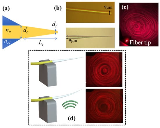 where d is the diameter of the fiber, and ncl and nc are the refractive indices of the cladding and the core, respectively. Our fiber has no cladding layer, which can support ~4583 modes when λ = 660 nm, d = 9 µm, nc = 1.5, and ncl = 1. We continuously tapered the core of the uncladded multimode step-index fibers (SMF-28) down to a certain diameter (dt = 0.5 µm, trapezoidal shape), which forces the higher-order modes to radiate to the surrounding medium at different points along the taper with a certain angle. The radiated modes interfere and form a circular fringe pattern (Figure 1c) [30]. When an acoustic field is applied to the fiber tip, the tip starts bending periodically, which changes the refraction angle of the higher-order modes and results in a different fringe pattern (Figure 1d). The change in the fringe pattern dramatically affects the output signal read by the multimode fiber. At the resonance frequencies of the tapered-tip fiber, the change in the signal amplitude is amplified, which results in much higher sensitivity values in contrast to non-resonant frequencies. In this concept, the tapered-tip fiber acts like a microcantilever, which is a suspended micro-scale structure supported at one end, which can bend and/or vibrate when subjected to a load. In our case, the tapered-tip fiber is the micro-scale beam structure, which guides the light itself rather than reflecting an external beam in the case of traditional microcantilevers. Acoustic waves generated by the piezo transducer were the loads that we imposed on this structure. The tapered-tip fiber was fixed on the non-tapered side to provide support.