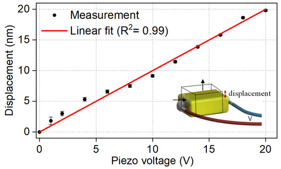 Measured displacement value of the piezo transducer at different voltage values. The inset shows the longitudinal displacement of the piezo when voltage is applied.
