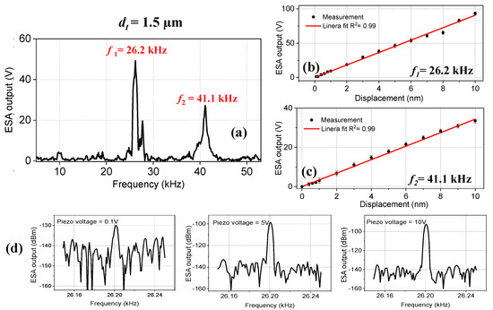 (a) The frequency spectrum of the tapered-tip fiber microcantilever with a tip diameter of dt = 1.5 µm. Two resonance frequencies were observed at f1 = 26.2 kHz and f2 = 41.1 kHz. The ESA output versus displacement values for (b) f1 = 26.2 kHz and (c) f2 = 41.1 kHz. The red line indicates the linear fit. (d) The ESA output spectrum at different V = 0.1 V, 5 V, and 10 V for f1 = 26.2 kHz.