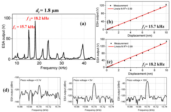 (a) The frequency spectrum of the tapered-tip fiber microcantilever with a tip diameter of dt = 1.8 µm. Several natural resonance frequencies were observed. The ESA output versus displacement values for the first two resonance frequencies of (b) f1 = 15.7 kHz and (c) f2 = 18.2 kHz. The red line indicates the linear fit. (d) The ESA output spectrum at different V = 0.1 V, 5 V, and 10 V for f1 = 15.7 kHz.