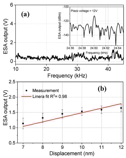 (a) The frequency spectrum of the regular fiber with a tip diameter of dt = 125 µm. No resonance was observed. The ESA output response at f = 24.6 kHz for the piezo voltage of 12 V is shown in the inset. (b) The ESA output versus displacement values at f = 24.6 kHz. The red line indicates the linear fit.