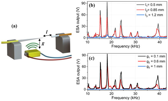 (a) Schematic indicating the parameters l and g. The effect of distance between (b) the tapered-tip fiber and the multimode fiber for three different values, and (c) the tapered-tip fiber and the piezo transducer for three different values on the frequency spectrum of the tapered-tip sensors. As can be seen, the frequencies of the resonances stayed the same but their amplitudes decreased with an increasing distance in both cases. Measurements were taken with tapered-tip fiber with a tip diameter of dt = 1.8 µm.