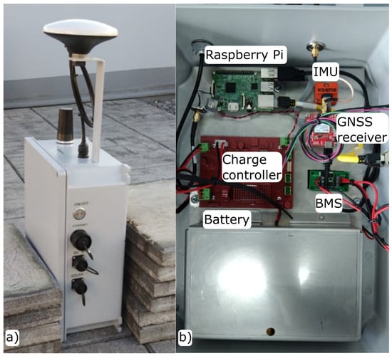 At the hardware level, each smart sensor node consists of three main blocks: (i) GNSS receiver and antennas, (ii) IMU, and (iii) processing unit. As the sensor must be based on cutting-edge mass-market technology, the GNSS receiver selected is an Ublox ZED F9P, a multi-band GNSS module with integrated multi-band RTK technology for centimeter-level accuracy. The inertial measurement unit chosen is the Xsens MTi-610, which is an industrial-grade, affordable MEMS-based orientation sensor with an easy-to-use open SDK []. It is a fully functional, self-contained module that contains a three-axis gyroscope, three-axis accelerometer, three-axis magnetometer, barometer, high-accuracy crystal, and low-power microcontroller unit. The main processing unit is based on the Raspberry Pi3 Model B+ because of its elevated efficiency, since it combines high computational power with low consumption, which makes it ideal for the concerned application. Furthermore, the system is equipped with two antennas: the first one is dedicated to GNSS signal reception (Tallysman TW3972, Kanata, ON, Canada), which is able to receive signals from multi-constellations and multi-frequencies, and its IP67 certification makes it suitable for maritime environments, while the second one is used for the wireless communication (@2.4 GHz) between smart sensor nodes and the concentrator unit and for receiving the real-time corrections. Finally, concerning the power supply of each node, a solar panel (SOLARA S320P41, Hamburg, Germany) is included to generate direct current and charge the battery integrated inside the smart sensor through the autonomous power supply subsystem. In this sense, a battery of 300 Wh and its corresponding power management system were selected to provide the system autonomy for more than 3 days even without any solar charge. The detailed block diagram is presented in Figure 2.