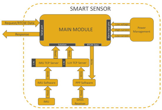 Figure 4 shows the software architecture of the smart sensor. The software has been developed under a Raspbian operating system. It manages the proper behavior and the correct communication between all parts that integrate it, in such a way that it sends the precise 3D motion to the concentrator. The main module oversees the coordination of the different parts of the system, handling its requests and responses and delivering the position or attitude solution to the concentrator when requested. It is also in charge of checking the sensors and power system alarms and reporting them and receiving the RTCM data that will be used by the real-time PPP software (RTKlib) for positioning estimation.