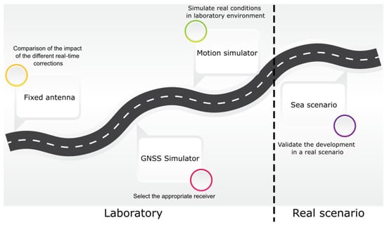 The validation of the smart motion sensor proposed was accomplished following a step-wise approach, starting from simple algorithm testing and verification of basic functionalities, and incrementally adding complexity to better represent real operation conditions. For this reason, three sets of tests were carried out: first, in a rotary table at the laboratory to check the sensor performance in the early stages of its development. After that, the registered motion of a floating platform in a water tank was used as input into the GNSS simulator, emulating similar conditions in platform locations. Finally, the low-cost smart sensor was validated in a real sea scenario. It should be noted that the development has been under certain requirements and restrictions such as low-cost perspective, modularity, and safety, as will be detailed in the following sections.