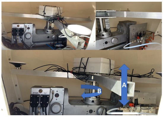 The other test conducted in the motion simulator was relative to the rotation around the A axis. As previously mentioned, due to space problems inside the radome, these movements were limited to 0–14°. The results obtained in this test are not obvious as those tested before. Ideally, only the up component must change (about 17 cm as shown in Figure 14) with the movements, and the other two should remain constant. However, these last two components also show small variations but always within the established margin of error (20 cm). These small errors may be caused by the vibrations produced in the movement of the platform and by the error of the real-time PPP solution itself.