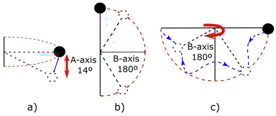 Due to the small space inside the radome, the movement in the A-axis was limited between 0 and 14° and repetitive movements between 0 and 180° were programmed in the B-axis, as detailed in Figure 7. The black point represents the antenna at the start and changes color to white when the rotary table starts moving (the antenna changes its position). Finally, the last test was carried out mixing both movements to simulate the platform motion. All these tests were performed in slow motion, changing 1° every second.