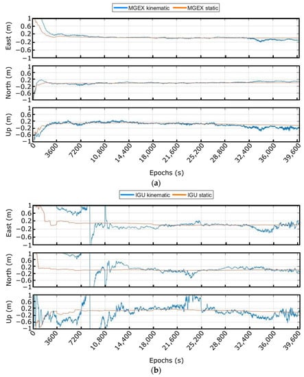 Post-processing results using (a) MGEX and (b) IGU precise products.