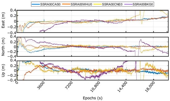 As a second set of tests in this case, PPP real-time solutions were computed with different real-time corrections to analyze their impact on the quality of the results. These real-time corrections are provided by several NTRIP broadcaster providers, and the precise orbits and clocks needed by the algorithm can be derived from them with periodicity of 60 s and 10 s, respectively. Figure 10 shows in ENU components, a capture comparing four different real-time corrections (SSRA00WHU0, SSRA00CAS0, SSRA00CNE0, and SSRA00BKG0).