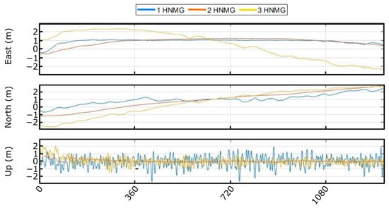 It can be noted that the convergence time with the MGEX precise products is around 30 min and 1 h in static and kinematic modes, respectively, and that the accuracy was kept below ±20 cm in both cases. With IGU’s precise products by their side, the achieved convergence time in static mode has risen to almost 1 h, whilst in kinematic mode this time has exceeded 4 h. On the other hand, the acquired accuracy in static mode was similar to the previous one. However, in kinematic mode, in the east and north component, the requirement to keep the error below ±20 cm was fulfilled; nevertheless, in the up component and after the convergence period, the error exceeds the allowed. Therefore, it can be concluded that the quality and the type of products for clocks and orbits influence the results.