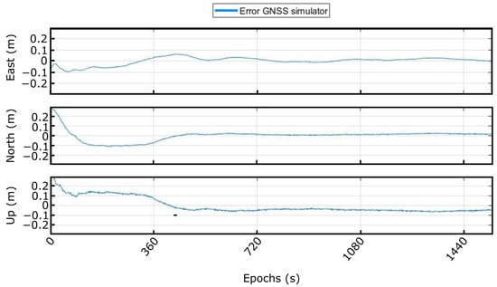 To compute the position error, this final solution has been compared with the files with the movement provided to the GNSS signal generator. Figure 12 presents the error achieved when using the GNSS simulator and post-processing technique. As expected, the RTK positioning error is below ±10 cm once the solution has converged.