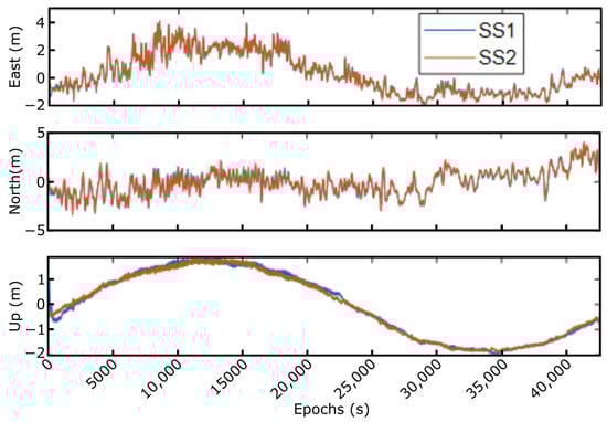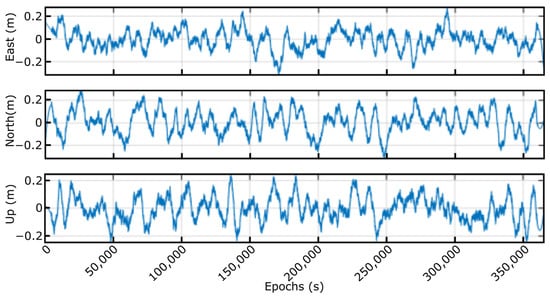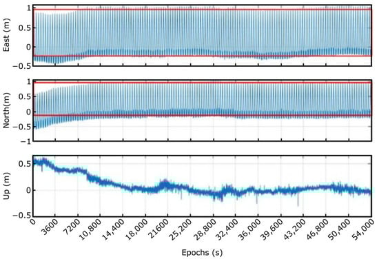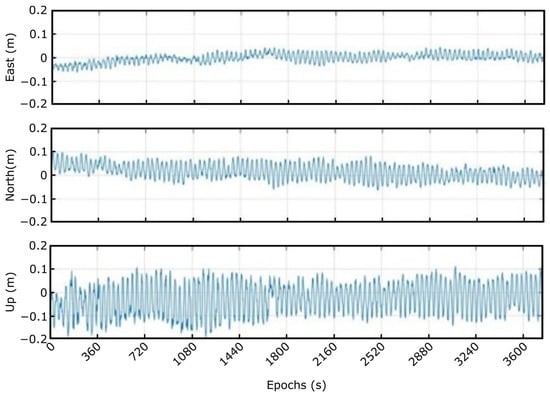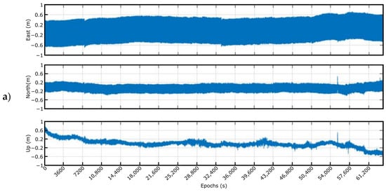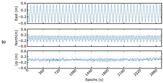 The last test in the rotary table was the movement combination of both axes to simulate the 3D platform motion. A capture of the results of this test that was taken around 18 h is represented in Figure 15. Observing Figure 15a, it can be noticed that the system is able to maintain the same dynamics during a long data capture. It is important to remark that in the case of losing convergence, the algorithm is able to recover it quickly, as can be distinguished around the 7200 and 54,000 epochs. To show these movements more clearly, in Figure 15b, one hour of the calculated solution is displayed. The movement’s periodicity in the east and north components is distinctly noted. The up component, however, shows small variation because of the high sensibility of this component with the geometry of the satellites.