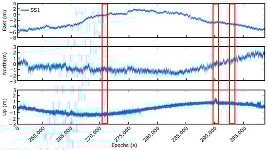 As mentioned before, the second set of tests was performed by only one smart sensor on a marking buoy in the Bimep area (https://www.bimep.com/, accessed on 14 November 2022), with some optimizations that were introduced in the system, especially in the employed battery, to increase the duration of the measurements. The main drawback with this new configuration was the determination of the solution’s accuracy. Using only one smart sensor and the low frequency of the data provided by the oceanographic buoy notably hinder the validation process of the proposed approach. In this sense, the precision of the solution provided by the smart sensor was calculated as the difference between this data and the results achieved by applying the RTK technique with the base station closest to the Bimep area. Considering the previous results obtained with the smart sensor and RTK post-processing technique, it is shown that the error is always less than 10 cm, and it can be considered that this method can be used as a precise reference solution (as the real position of the buoy). Therefore, and considering all the above-mentioned, an interval of the smart sensor data obtained during the real-time tests is shown in Figure 17. In these measurements, the sensor was able to provide, with some punctual losses of corrections, the estimated position of the buoy continuously and with the established precision, as will be discussed later. In the moments that the corrections were lost (red rectangles in the figure), the sensor is capable of rapidly converging and recovering normal operation, providing the real positioning measurements.