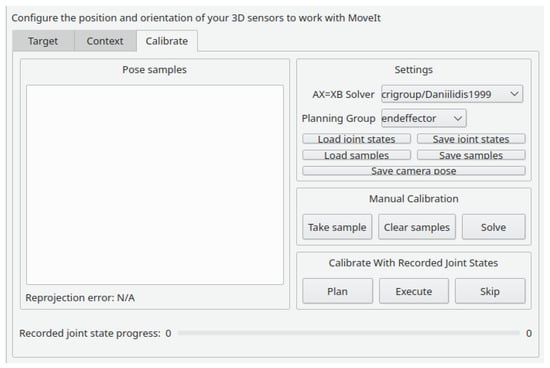 There is also an ROS calibration tool specific for addressing the hand–eye calibration problem called moveit_calibration (https://github.com/ros-planning/moveit_calibration, accessed on 25 November 2022) [,]. The hand–eye calibration produces an estimate of the transformation between the end effector of a robotic manipulator and a camera mounted on that end effector. It is useful for several applications, such as pick and place or 3D reconstruction. This approach supports only RGB cameras, and the calibration pattern is an ArUco board. The data acquisition and labeling are done simultaneously. This ensures that the user has immediate visual feedback on the produced labels, allowing a more deliberate choice of when to acquire data. As in robot_calibration, the data acquisition can be done manually or by pre-planning a path and collecting images on each waypoint. The estimation of the parameters is done without any visual feedback. It outputs an ROS launch file, which publishes the estimated extrinsic parameters as ROS tf static transformations. The UI is based on ROS 3D Robot Visualizer (RViz). The user can define the calibration parameters, acquire data and visualize data labels, as seen in Figure 2. The calibration is done automatically after collecting five data samples and is recomputed each time a new sample is added.